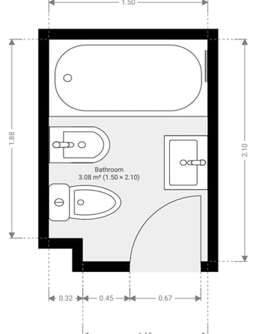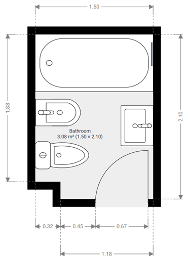 En este artículo asumiremos un caso real para un baño típico de los que se encuentran en la Capital Federal, para que luego puedas comparar con el que estas analizando. Vamos a suponer un baño con bañera de 2,10 x 1,50 m, con 50 años de antigüedad (construido entre 1975 y 1980). A continuación de mostramos una foto de referencia y un croquis con las medidas en planta.